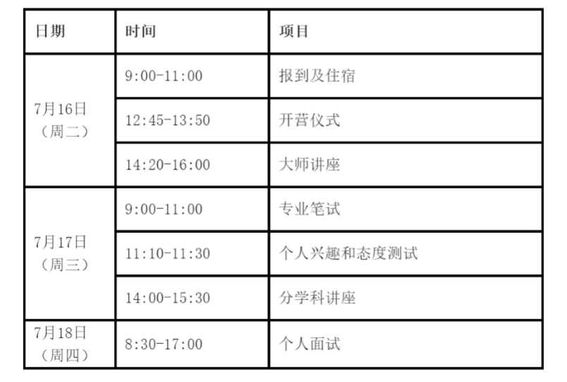 学术营只有2-3天,考核中会穿插一个去福田校区的参观和讲座活动。考核包括数学笔试、无领导小组讨论和英文单面。